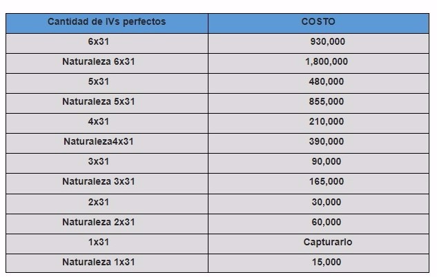 En esta tabla se encuentran los costos mínimos, que conlleva criar un pokemon, ya sea con una naturaleza determinada o con una naturaleza al azar, estos precios van desde un 6x31 hasta un 1x31. En estos costos no se han tomado en cuenta las pokebolas ni la correcion de generos, por lo que casi siempre les saldrá un costo mayor que este, solo les dejo esta tabla, para que tengan una idea de lo que les puede costar un criar un pokemon con una cierta cantidad de ivs perfectos a base de puros pokemons 1x31