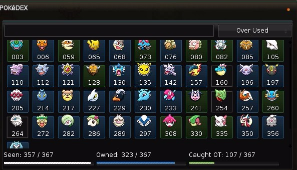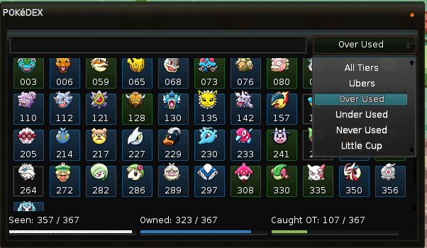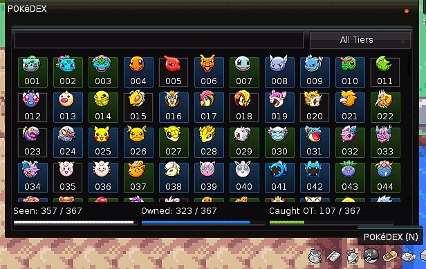 Haciendo Click en la Letra (N) oh simplemente dando ala pokedex encontraremos un cuadro con todo los pokemones, Dentro de el veremos que esta dividido entre pokes que emos visto, atrapados y capturados por nosotros mismo, También uno donde dice (ALL TIERS) "todas las categorias".